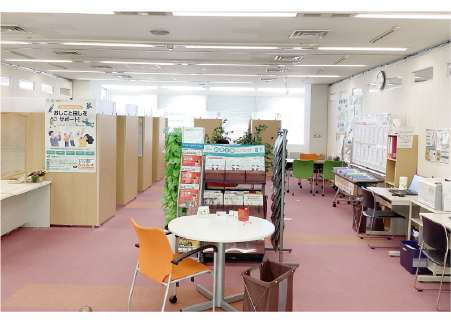 施設内メインスペースには、カウンセリングブース、PC利用スペース、待合スペースがあります。